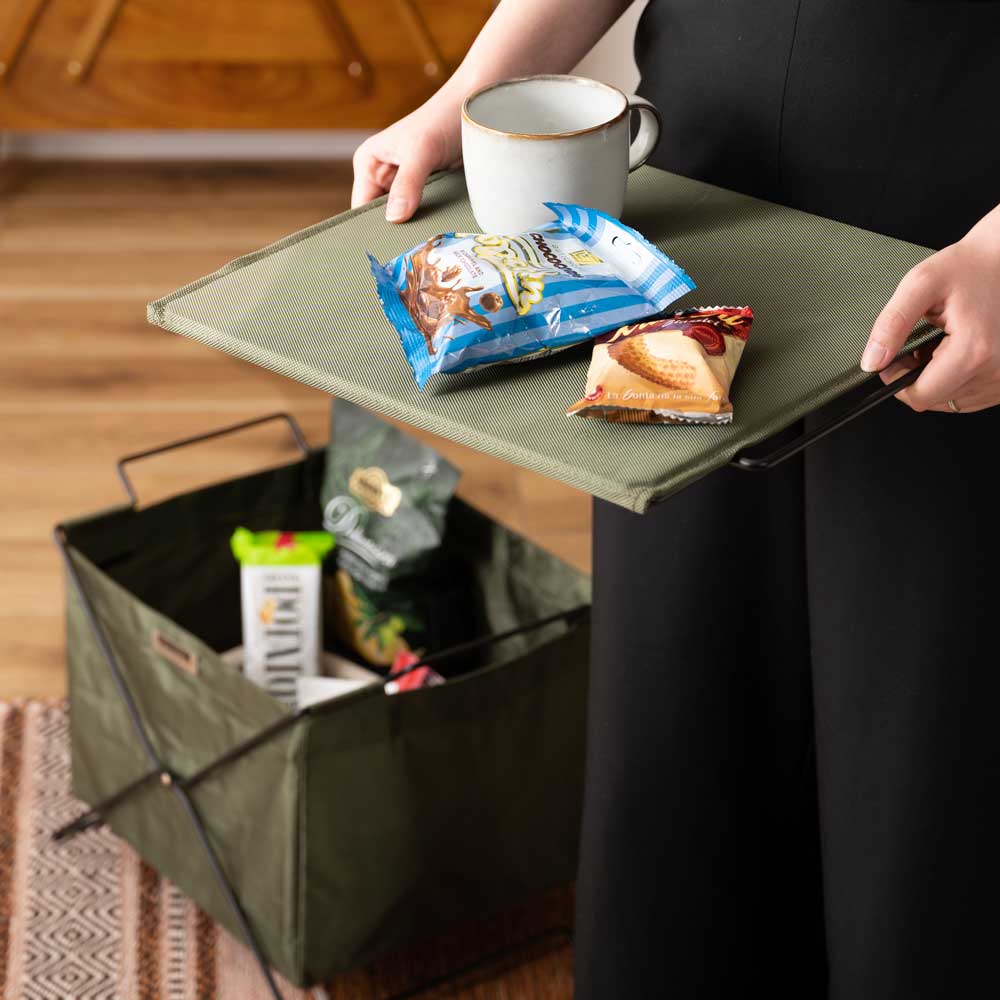 使わない時は折りたたんで省スペース収納、フタは取り外してトレーとしても使用可能です。