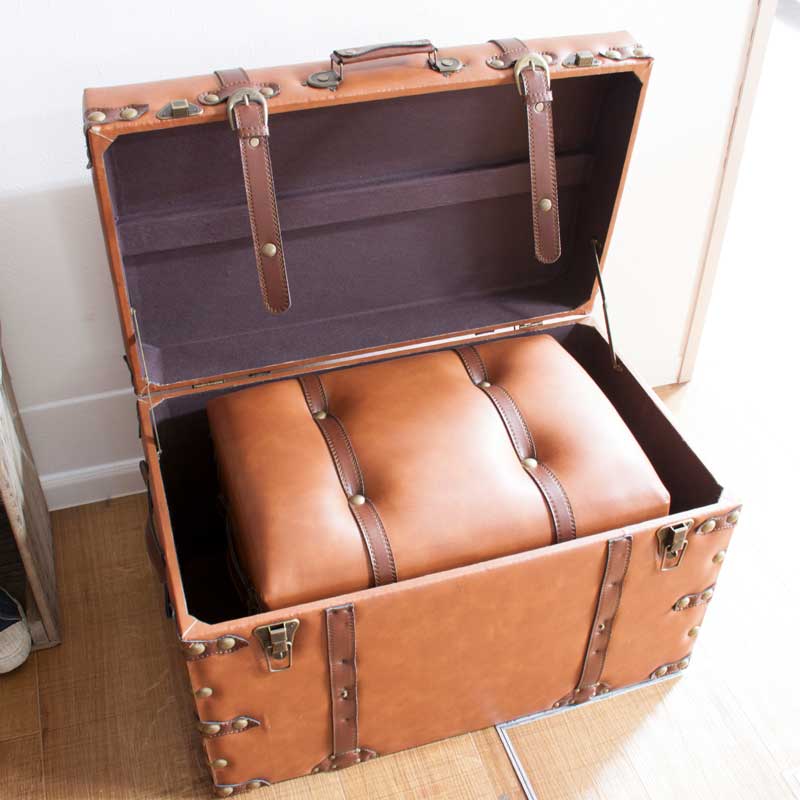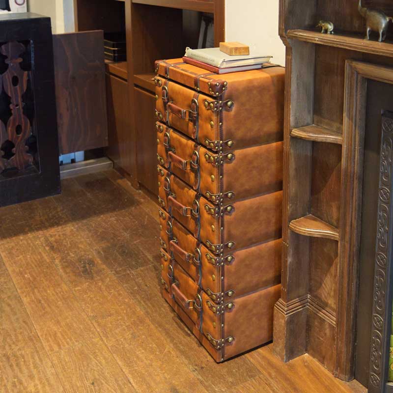 トランク風3段チェスト|ヴィンテージ映えるレザー調収納